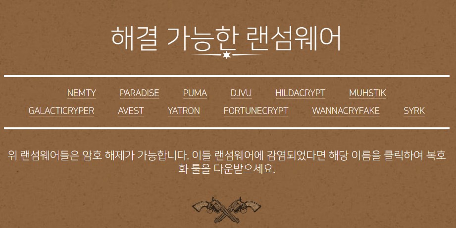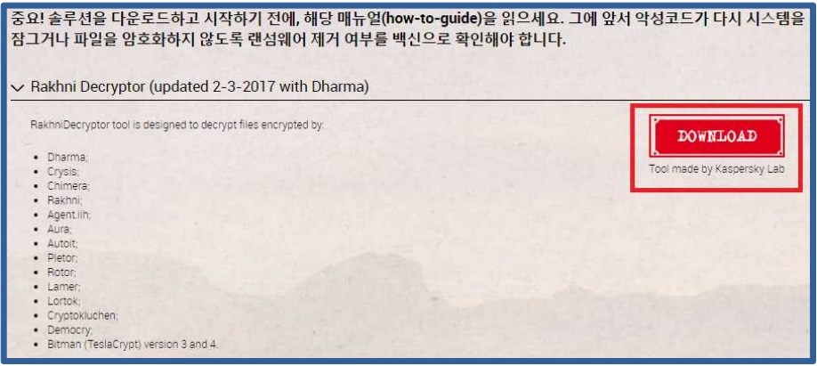 또한 이 사이트에는 다양한 종류의 복구툴이 있어 감염된 랜섬웨어 종류에 맞는 랜섬웨어 복구툴을 사용하여야 합니다