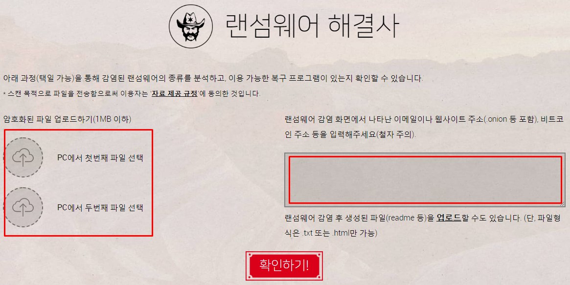 우측에 랜섬웨어 감염화면에서 찾을 수 있는 이메일이나 웹사이트주소, 랜섬웨어 감염시 자동으로 생성된 readme.txt 등의 파일을 추가적으로 업로드할 수 있습니다