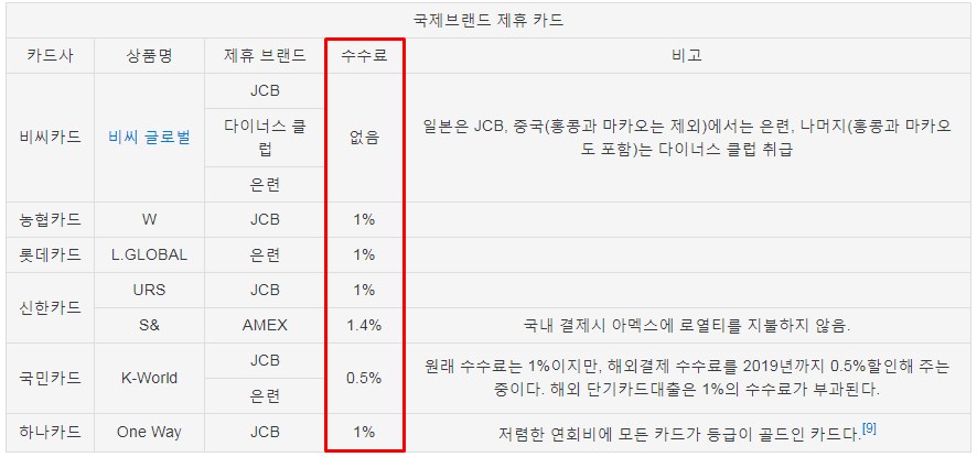 두 브랜드는 해외결제 사용 수수료도 비싸지 않고 발급받기도 쉽기 때문에 해외에서 불편없이 카드를 사용하려면 비자나 마스터 브랜드가 붙어있는 카드 1장은 필수입니다
