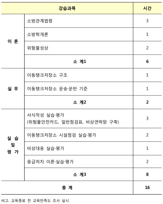 위험물운송자 강습과목 및 시간은 아래와 같습니다