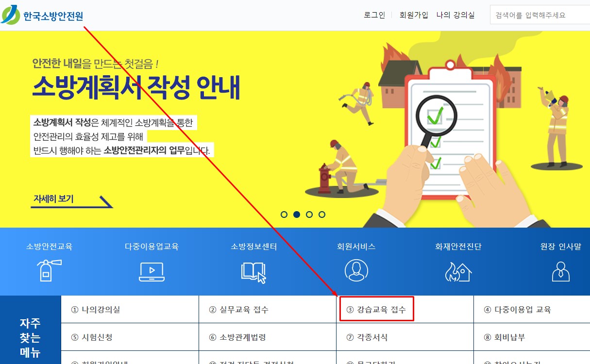 먼저 한국소방안전원 홈페이지에 접속하셔서 강습교육 접수 메뉴를 클릭합니다