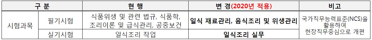 필기시험은 2020년부터 일식 재료관리, 음식조리 및 위생관리로, 실기는 일식조리 실무로 변경됩니다