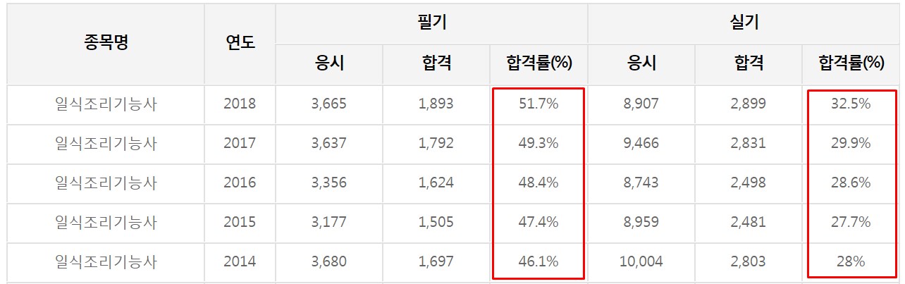 일식조리기능사 필기합격률은 점차 증가하는 추세입니다
