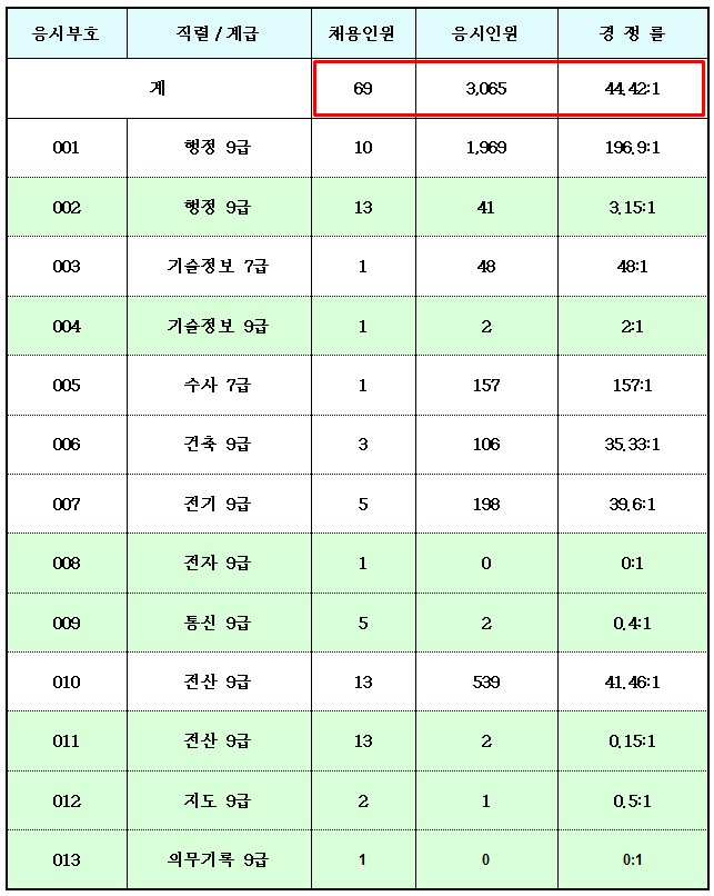 가장 많은 분들이 응시하는 행정 9급의 경우 196:1의 경쟁률을 보였습니다