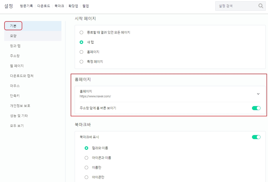 웨일 브라우저 시작페이지 변경방법